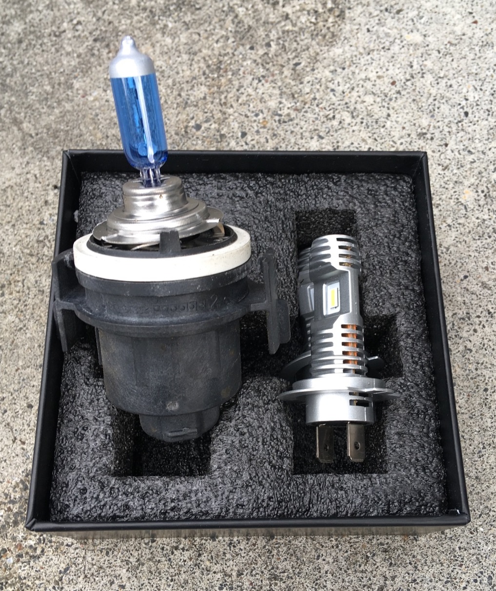 左が付いていた高効率ハロゲン6000Kです。そして右が今回間違えて買ってしまったLED H7.12000LM, 6000Kです。 |